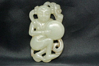 This intricately carved jade figure from the Qing Dynasty (18th century) is crafted from fine white Hetian jade, prized for its smooth texture and subtle translucency. The carving depicts a seated figure, possibly a musician or an immortal, holding a round instrument such as a hand drum or a pipa, evoking themes of celebration, music, or harmony. The flowing lines of the limbs and garments, paired with the serene facial expression, exhibit the refined craftsmanship characteristic of the Qing period. The openwork carving technique, which allows for light and shadow interplay, further enhances its three-dimensionality and liveliness. The surface shows a soft luster and natural patina developed over time, while minor fissures and natural inclusions are visible, typical of antique jade carvings. The reverse is smoothly finished, making the piece suitable as a pendant or belt ornament in its original use. As both a decorative and symbolic object, this piece embodies classical Chinese aesthetics and carries auspicious connotations related to music and joy. It remains in good condition with no major damage, making it a valuable addition to any collection of antique Chinese jade.