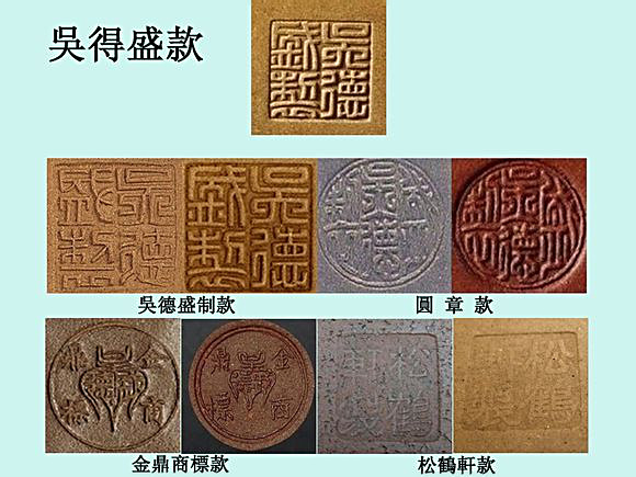 The Jin Ding trademark is a square seal with a design of a ding (three-legged kettle) in the center and a relief seal script "Jin Ding trademark", which was used as a seal for tea pots made to order at Wu Desheng's shop. In the later period, Wu Hanwen also added the "松鶴軒 (Song He shop)" square seal in standard script to his tea pots. The inscriptions "吳德盛" or "金鼎商標" were placed on the bottom of the jar, and the lid was generally marked with a small square seal of the teapot maker. Because the store went bankrupt after the outbreak of the War of Resistance, the "吳德盛" and "金鼎商標" inscriptions were not used until the end of 1939.