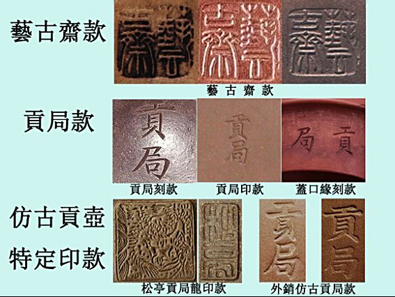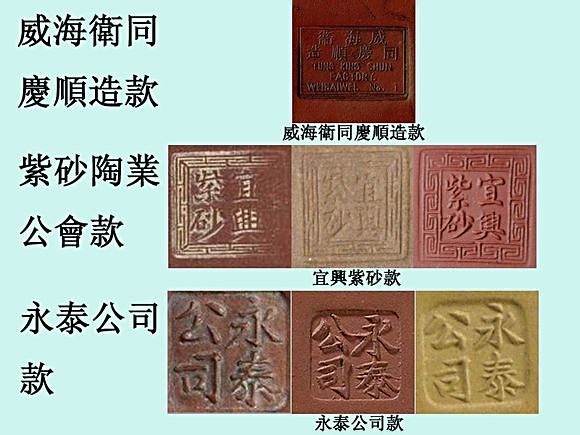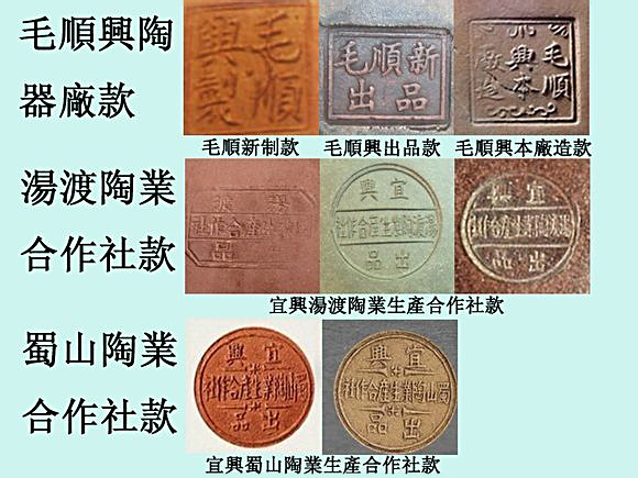 Yixing Purple Sand Crafts Factory (宜興紫砂工芸廠), "中国宜興 (China Yixing)" and other inscriptions from the 50s to the 90s.