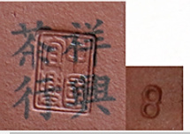 The Chen Dinghe (陳鼎和) Purple Sand Pottery Shop was founded in 1916 by Chen Yuanming (陳元明), the president of the shop, and had branches in Shanghai and Yixing. In the early years, a large square seal with the name "陳鼎和" in relief standard script was placed on the bottom of the pots, and in the middle period, a large square seal with the name "陳鼎和" in relief standard script and a seal script "陳鼎和陶器廠 (Chen Dinghe Pottery Factory)" were used in combination. In the latter half of the period, the large square seal "陳鼎和" and the maker's signature were used again. Some of the signatures are written in English.