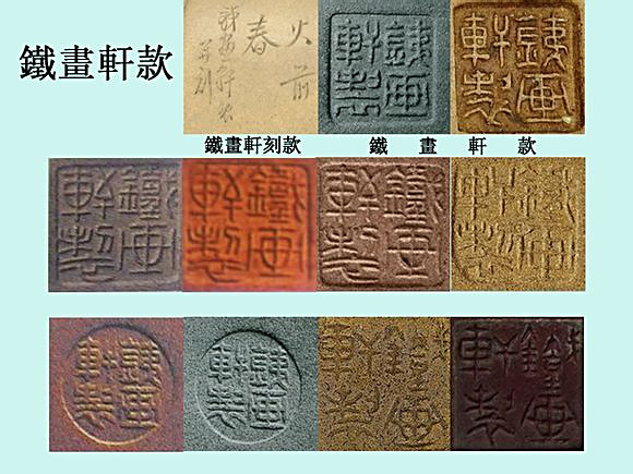 Tiehuaxuan (鉄画軒) Purple Sand Pottery Shop was established in Shanghai in 1900 to trade in Yixing ceramics. The founder, Dai Guobao (戴国宝), was once a master potter who painted flower patterns on ceramics with an iron needle. In the early days, Tiehuaxuan engraved the three characters "鉄画軒" in vertical writing on tea pots as his signature. The engraving method using a knife was bold, and there are two types of engraving, one in standard script and the other in running script. In the later period, there are two types of inscriptions: large pot inscriptions and small pot inscriptions. The large pot seal was a large square or round seal on the bottom of the pot with the relief seal script "鉄画軒制". The small pot had a small, long seal on the bottom with the relief writing in standard script, "鉄画軒制". The pot lid and handle have the signature of the tea pot maker. The owner's inscription is "戴氏 (Dai Shi)" and there are also inscriptions "Jade Ping Sheng" and "Jade Taoist" on the lid and handle.